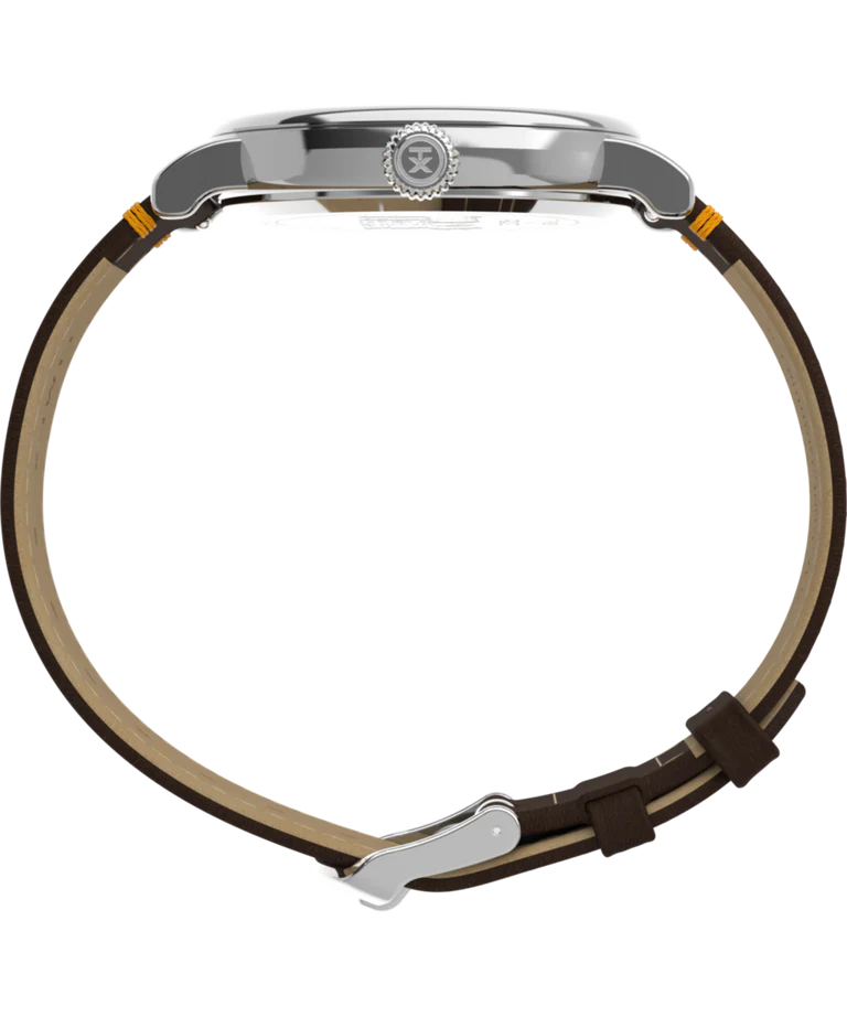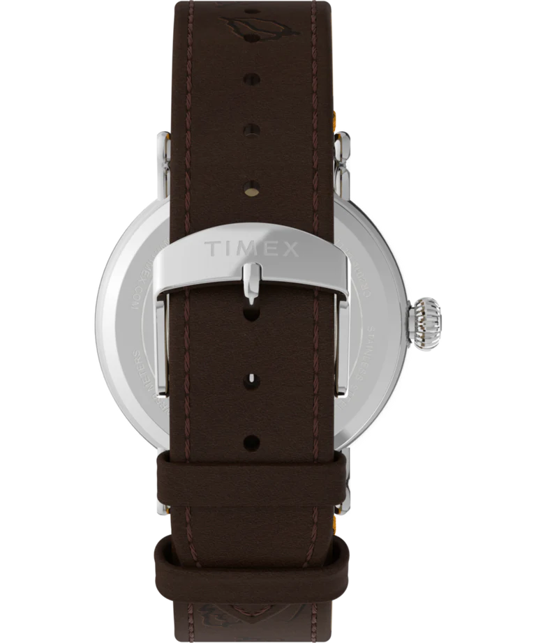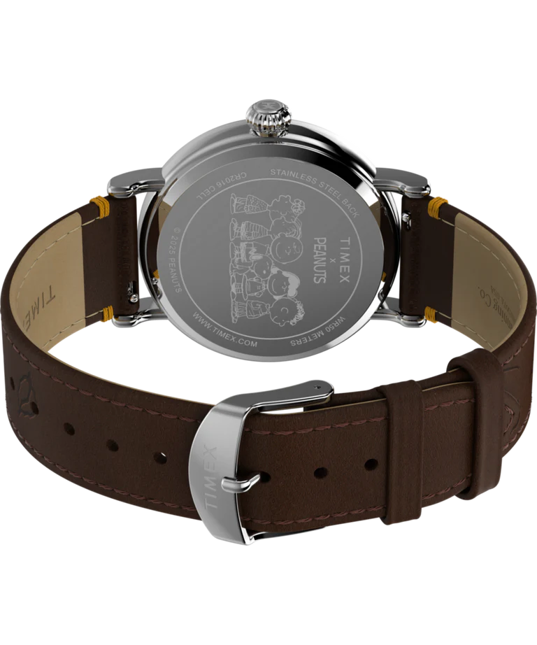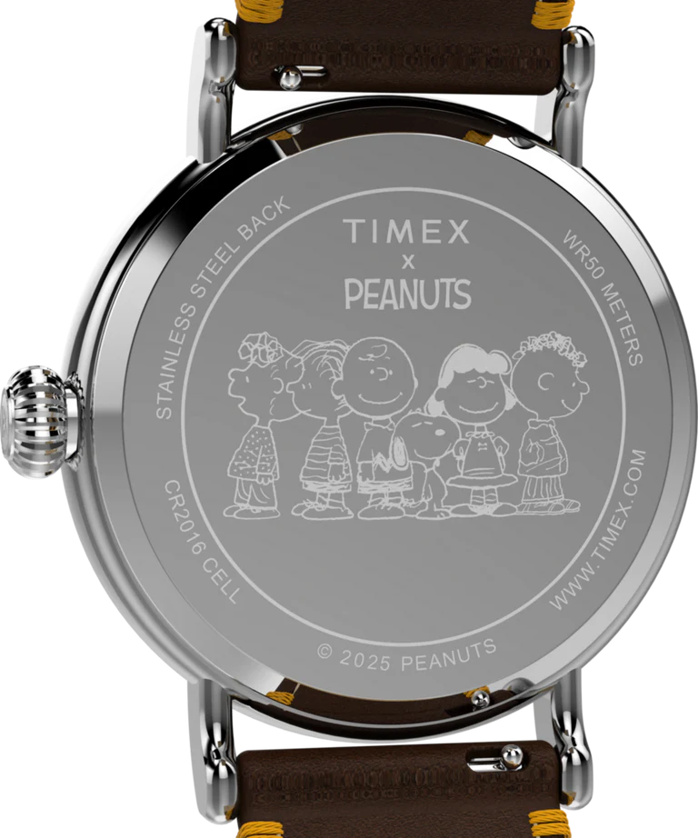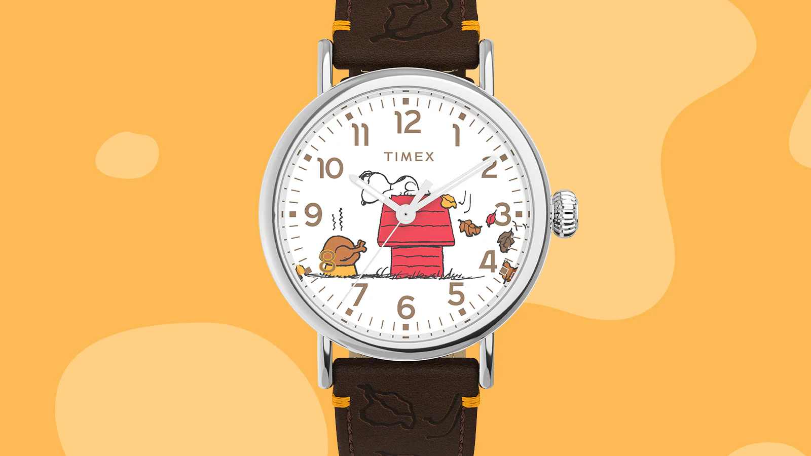 值得感恩的事情太多了!史努比的目光落在了我們這款 Timex Standard 腕錶白色錶盤上的火雞圖案上。這款腕錶採用 40 毫米拋光銀色錶殼、夜光指針、INDIGLO® 背光技術,確保夜間清晰讀時,並搭配飾有俏皮樹葉壓紋的棕色天然皮革錶帶,側邊縫線採用撞色設計。