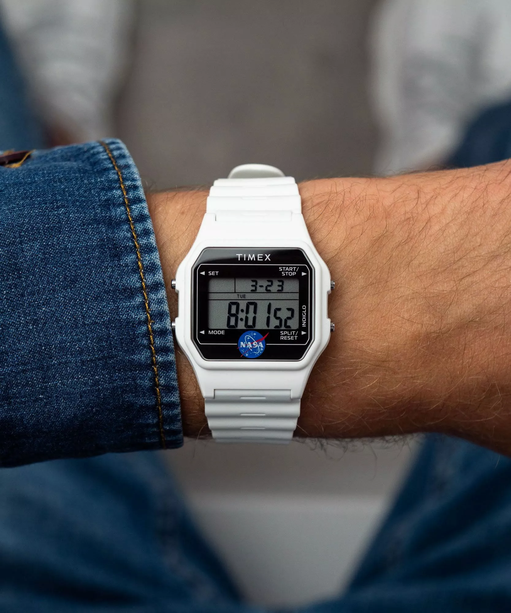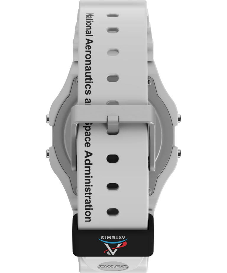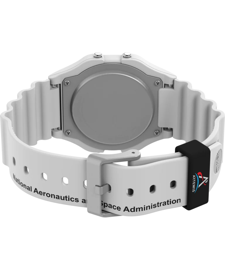 Timex Main Street Classic Digital TW2Y13500 男士腕錶的設計靈感來自太空旅行。錶殼和錶帶均採用白色,象徵月球表面的顏色。黑色錶盤上飾有標誌性的 NASA 標誌。這款腕錶具備日期、星期、月份顯示、計時器、鬧鐘和 Indiglo 背光等實用功能,即使在黑暗中也能清晰讀時。錶盤採用壓克力玻璃保護,30 公尺防水性能可抵禦意外濺水。