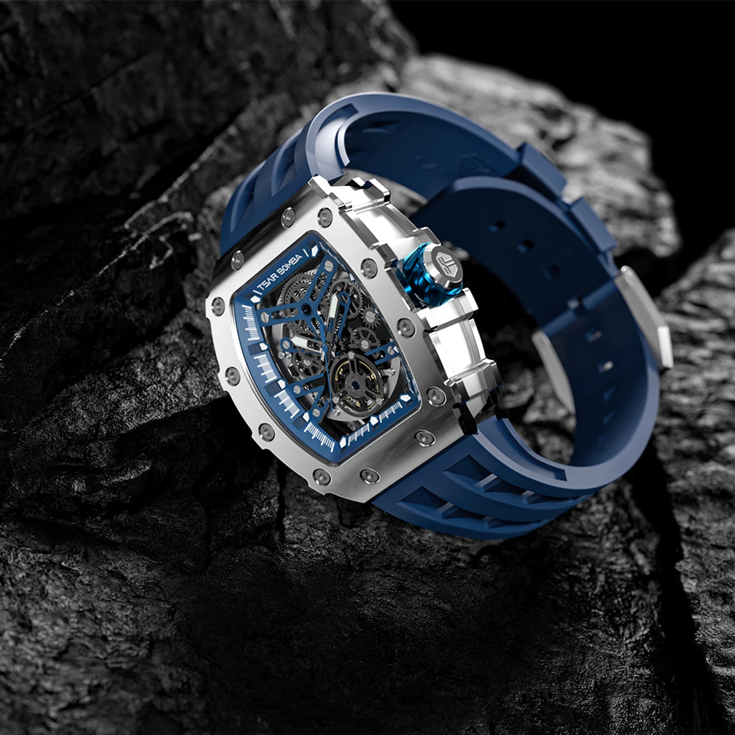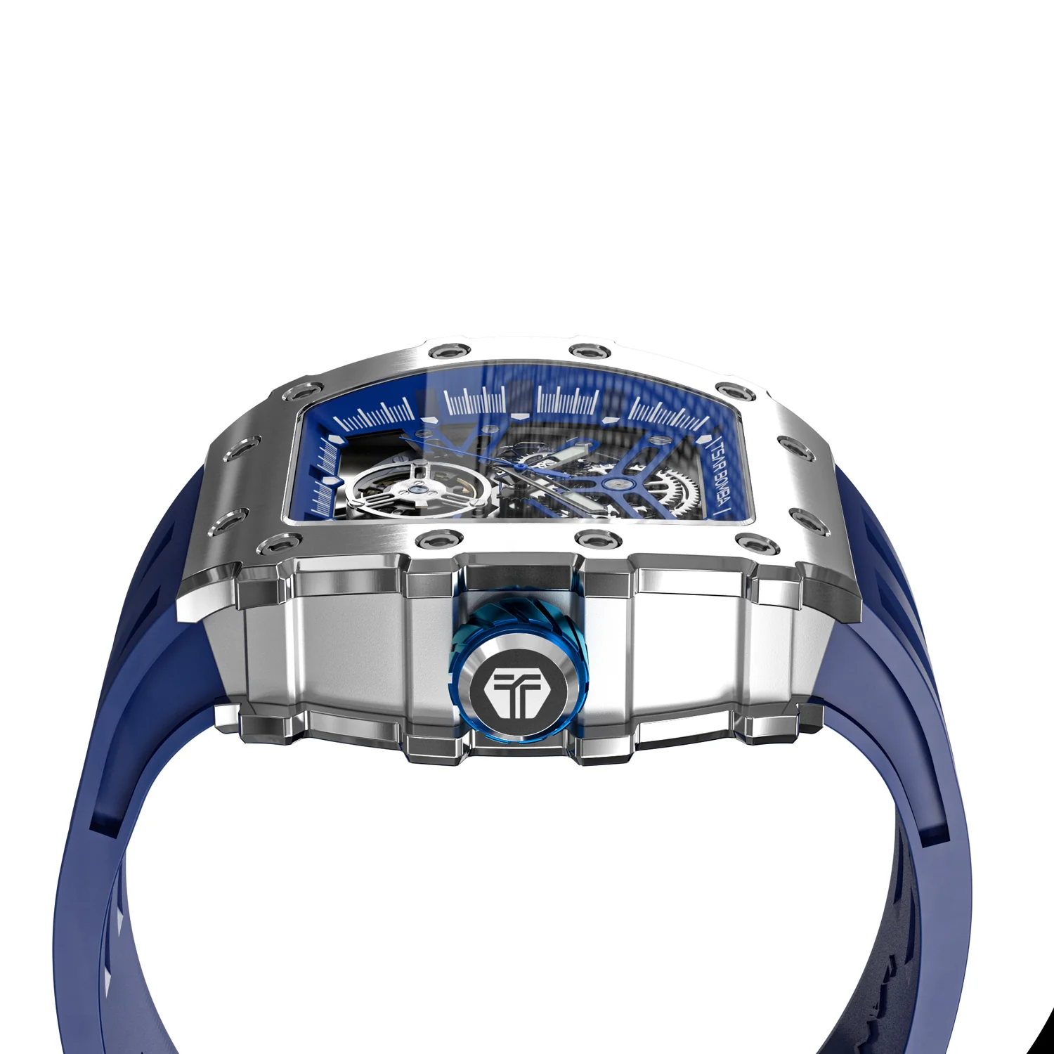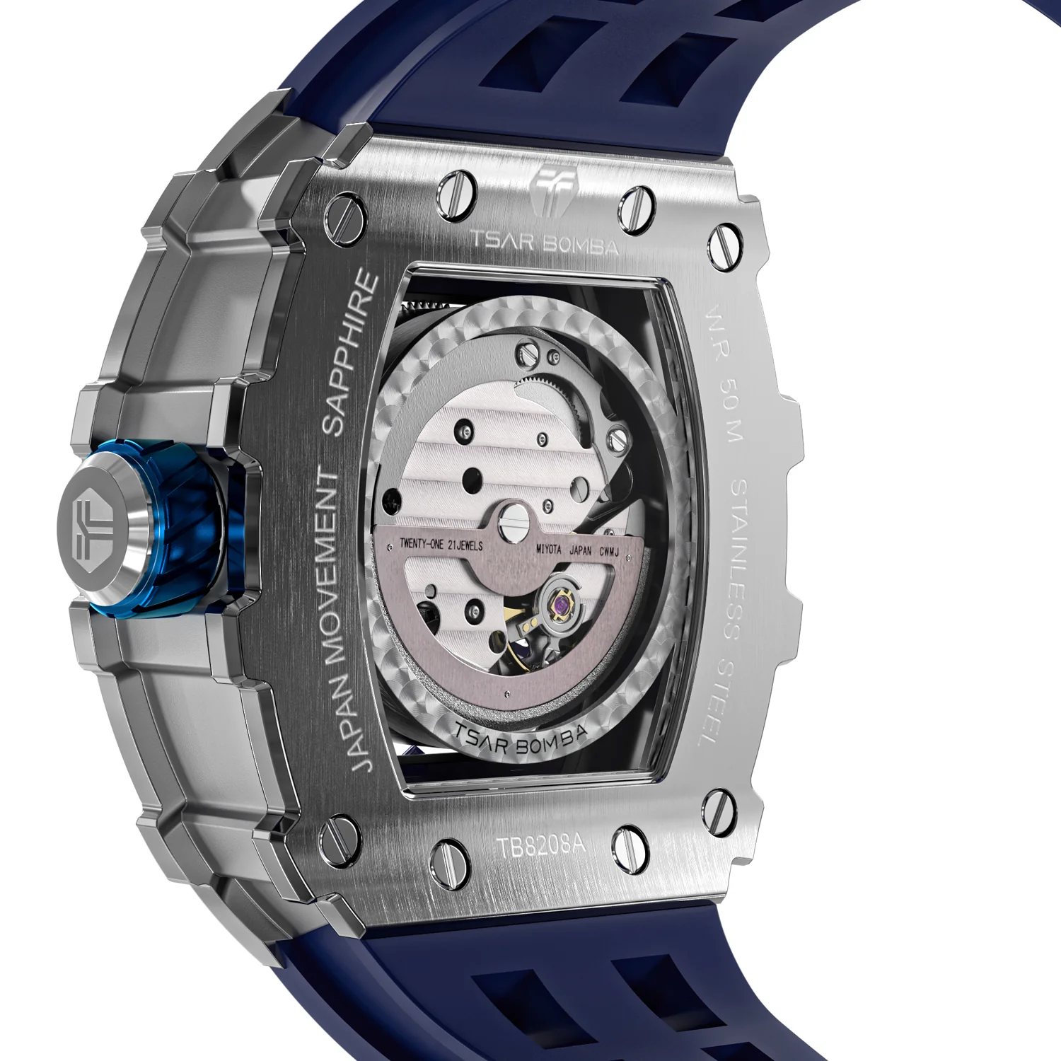 萬年鐘錶 - TSAR BOMBA 機械公爵 銀色框矽膠錶帶機械透視機芯男錶 TB8208A-11 錶徑 43MM