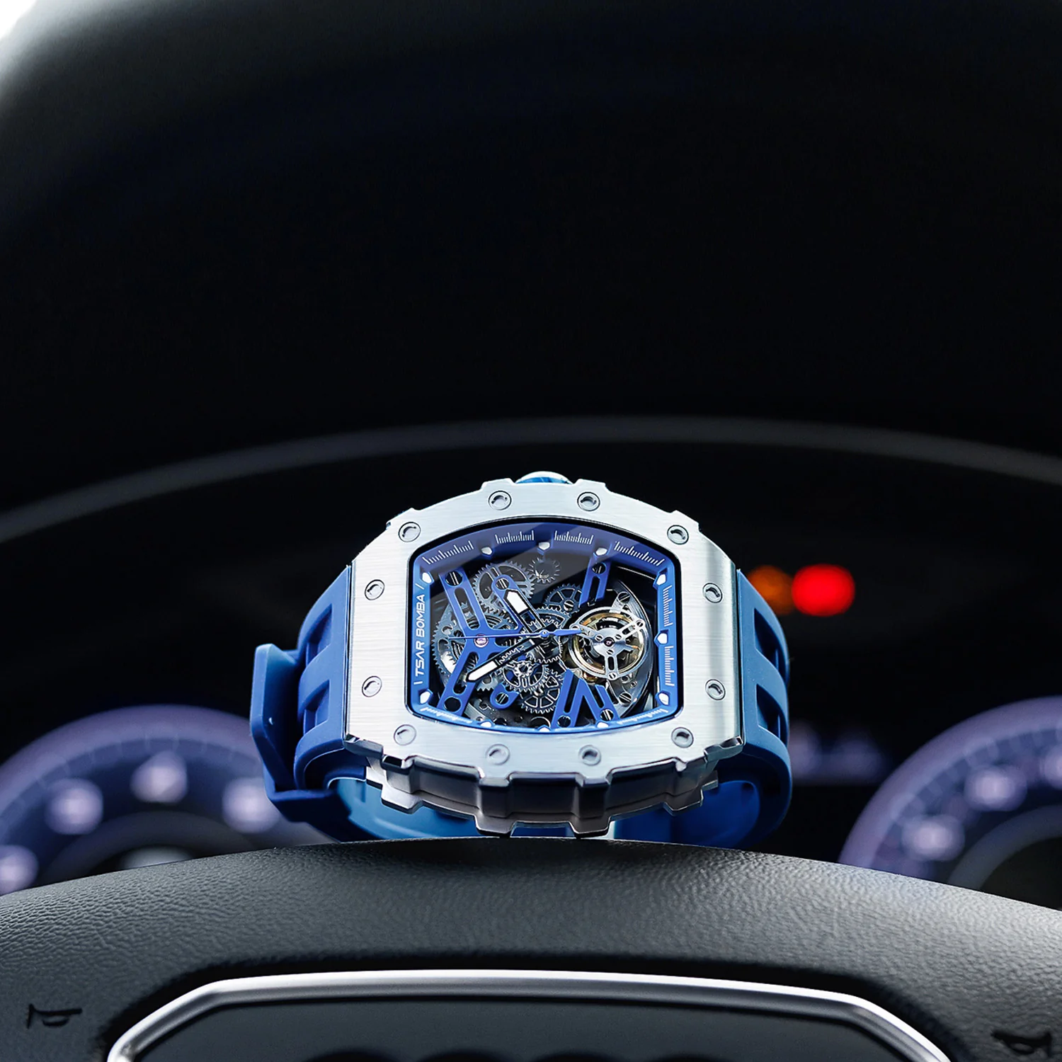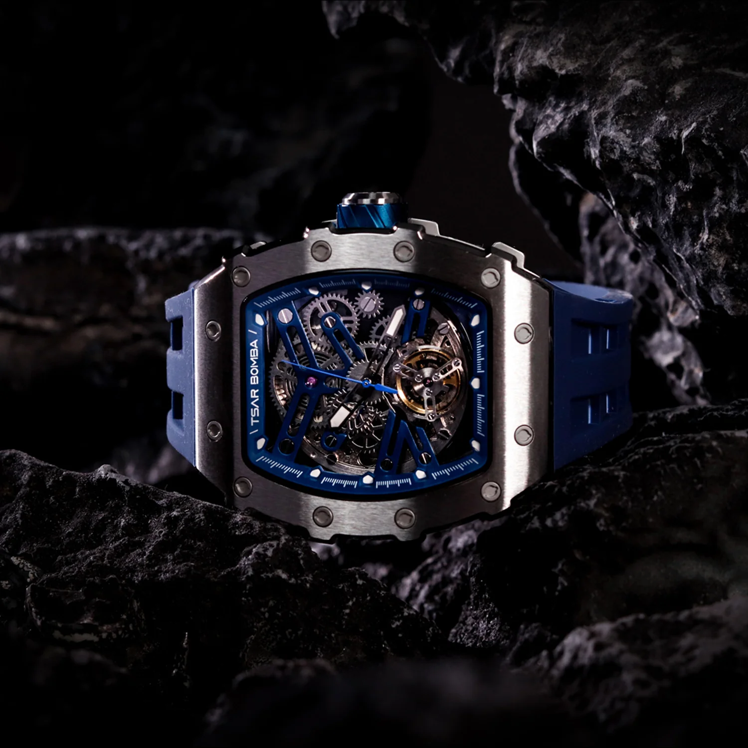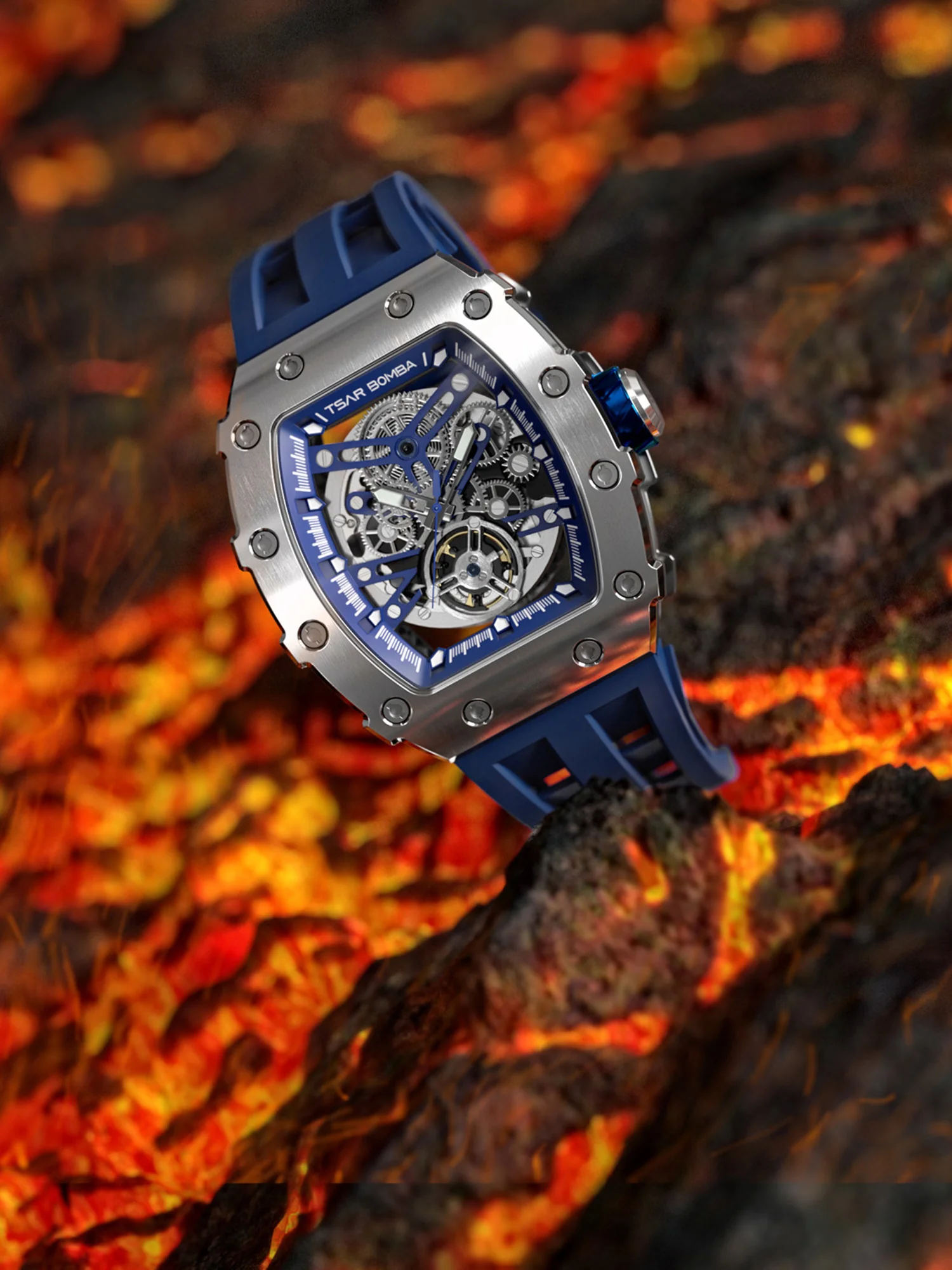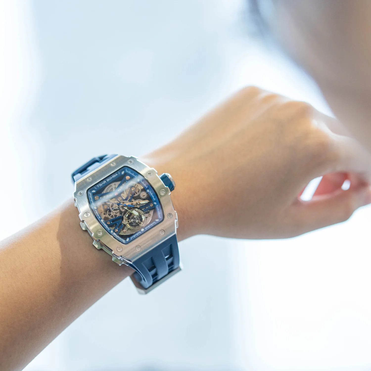 萬年鐘錶 - TSAR BOMBA 機械公爵 銀色框矽膠錶帶機械透視機芯男錶 TB8208A-11 錶徑 43MM