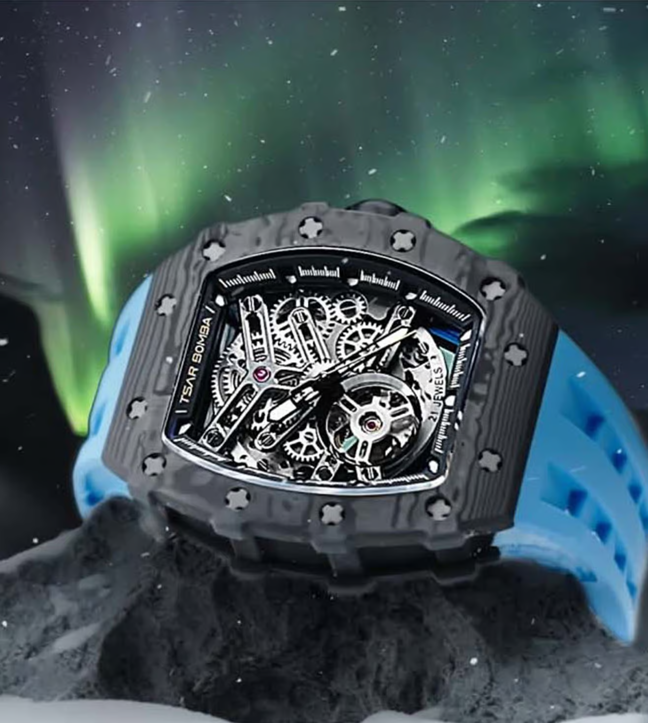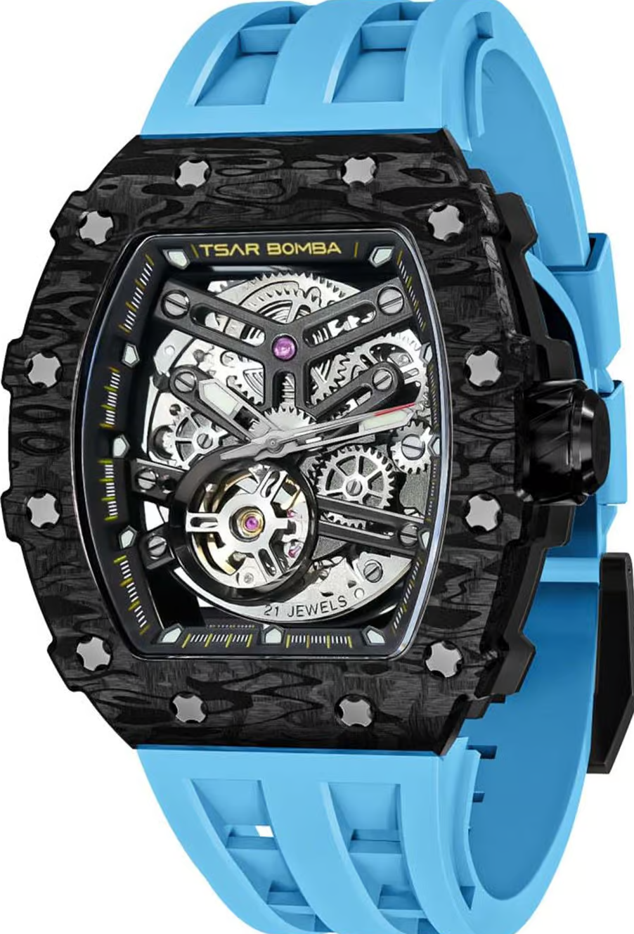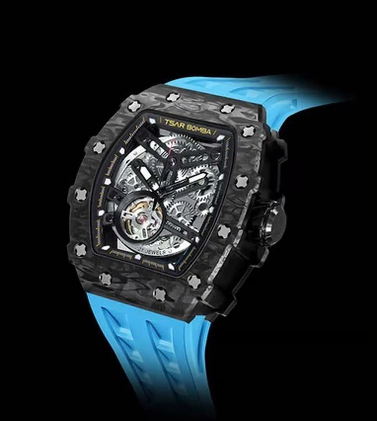 萬年鐘錶 - TSAR BOMBA 機械公爵 碳纖維錶框三眼計時藍色氟橡膠錶帶男錶 TB8208CF-11 錶徑 43MM