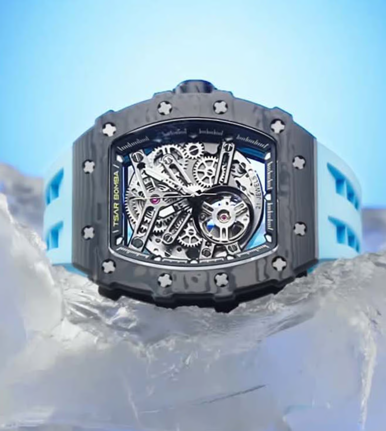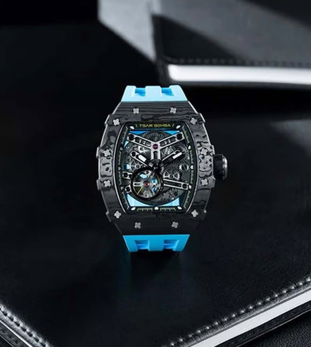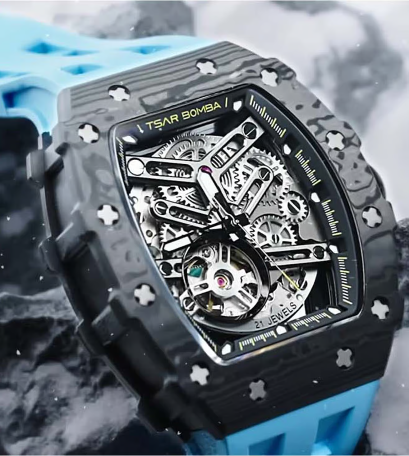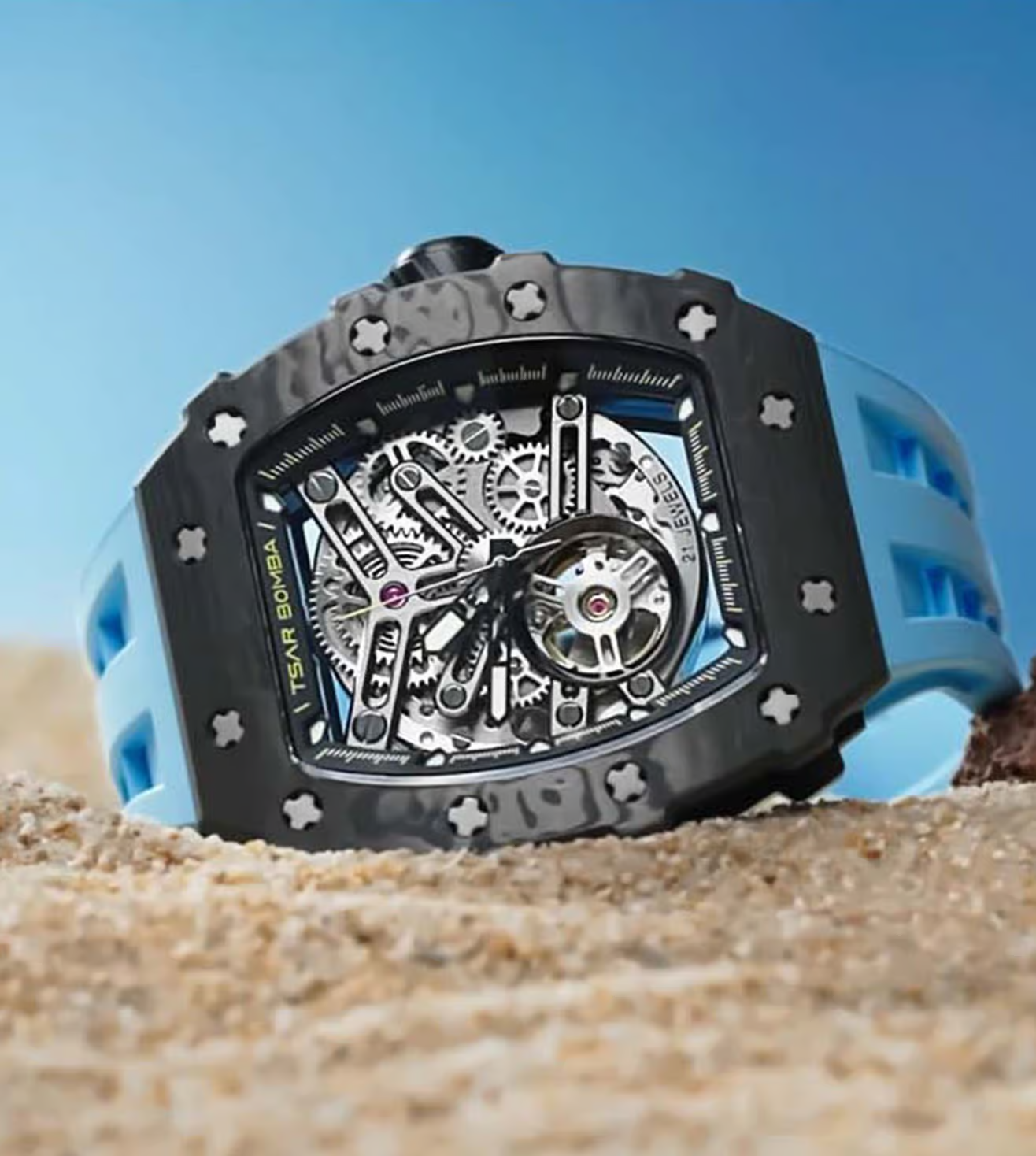 萬年鐘錶 - TSAR BOMBA 機械公爵 碳纖維錶框三眼計時藍色氟橡膠錶帶男錶 TB8208CF-11 錶徑 43MM